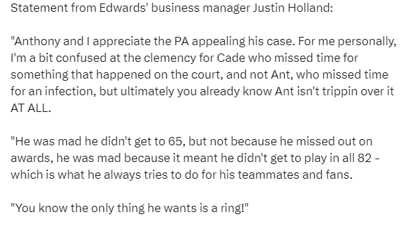 对此,爱德华兹的商业经理贾斯汀·霍兰德声明: 安东尼和我感谢球员工会为他的案件提出申诉。对我个人来说,我有点困惑,联盟对凯德(坎宁安)的宽大处理是因为他因场上发生的事情而缺席比赛,但爱德华兹却不行,他是因为感染而缺席比赛。