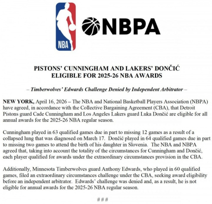 NBA官宣,根据NBA劳资协议相关条款,NBA与球员工会(NBPA)已达成一致,东契奇和坎宁安都获得2025-26赛季常规赛所有年度奖项的评选资格。